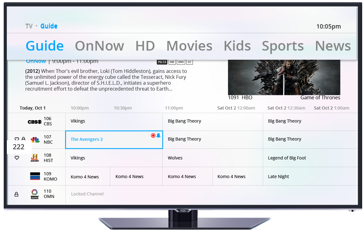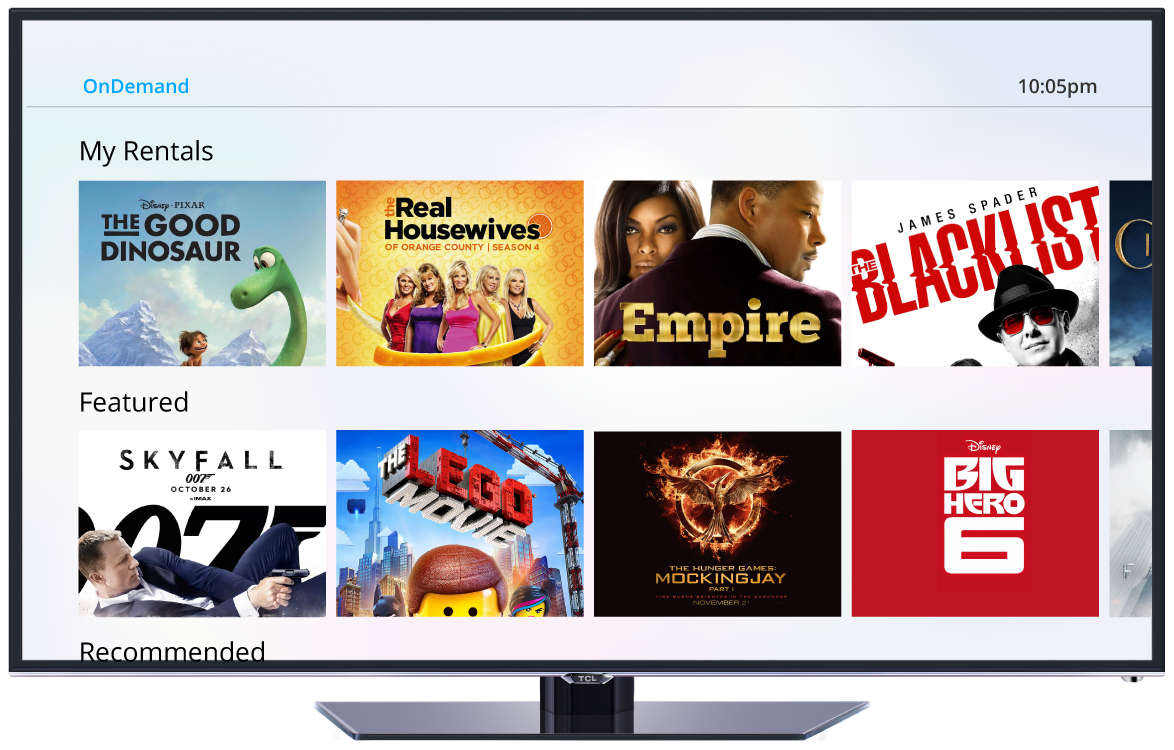 Shown here without sticky menu keypress for easy navigation through categories. My rentals is featured here by default. Categories are customizable by a configuration file for the cable operator. Interaction takes place by navigation via up, down, right, and left arrows on the users remote control.