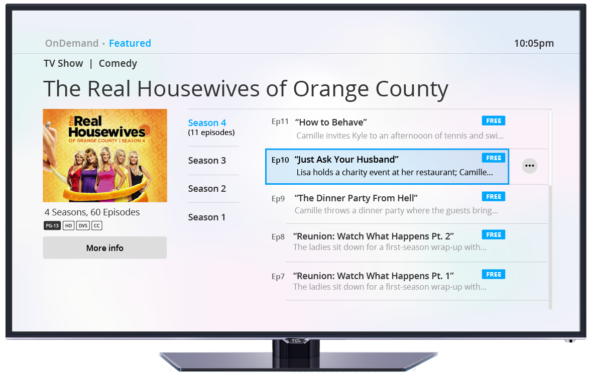 This is an example of a program info page which breaks down a TV series by season and episode. Items needing a subscription to watch are called out in the user interface.